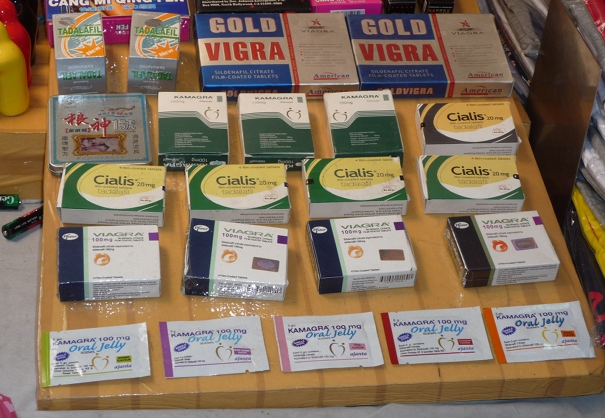 Along with sex toys, police found counterfeit Viagra and Cialis, among others.
