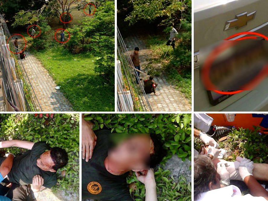 The photo’s caption read, “The incident happened at around 10am on Mar. 17 when two men, allegedly part-time undergraduates, were parking their Chevrolet sedan in front of a Government Savings Bank branch inside Ramkhamhaeng University’s Huamark Campus. The on-duty security guard prohibited the men from parking there, subsequently resulting in a fight.”