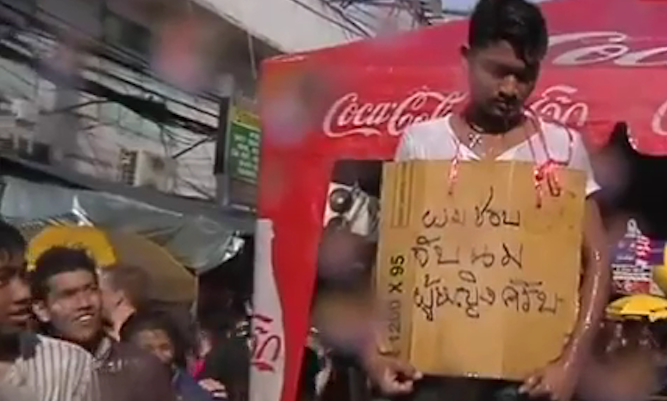 Two Songkran gropers on Khao San Road were rounded up by police last week and made to stand on a table in the middle of the waterfight mayhem with a sign around their neck that said “I love touching ladies breasts.”