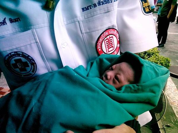 Detchart Puangkade, a social-media-savvy motorcycle taxi driver who operates at the spot, wrote in his blog that paramedics were sent from Hua Chiew Hospital to help the woman give birth in an open-air operation room. In one of his tweets, Detchart, or @motorcyrubjang, praised the professionalism of Hua Chiew officers, claiming that they worked quickly and dispatched the delivery capably.
