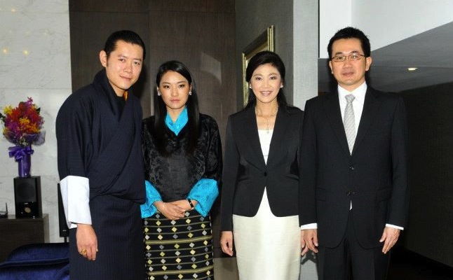 The King of Bhutan and his new bride met Prime Minister Yingluck and her common-law husband Anusorn Amornchat in Bangkok recently for a luncheon party and photo op at Emporium Suites Hotel.