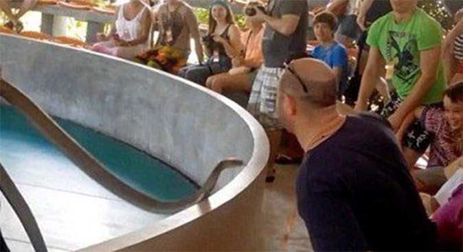 The footage, which was filmed by Russian tourist Dmitriy Bodnar, shows the audience enjoying the bizarre act at a venue reportedly in Phuket. During the clip, the snake leapt into the crowd, arching its neck at terrified crowd members.