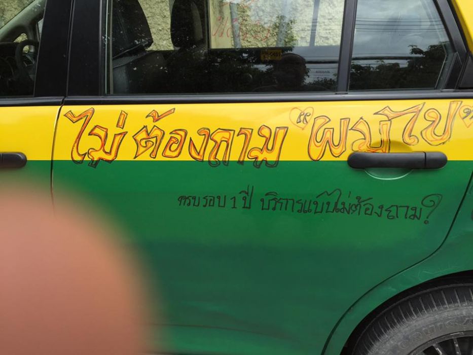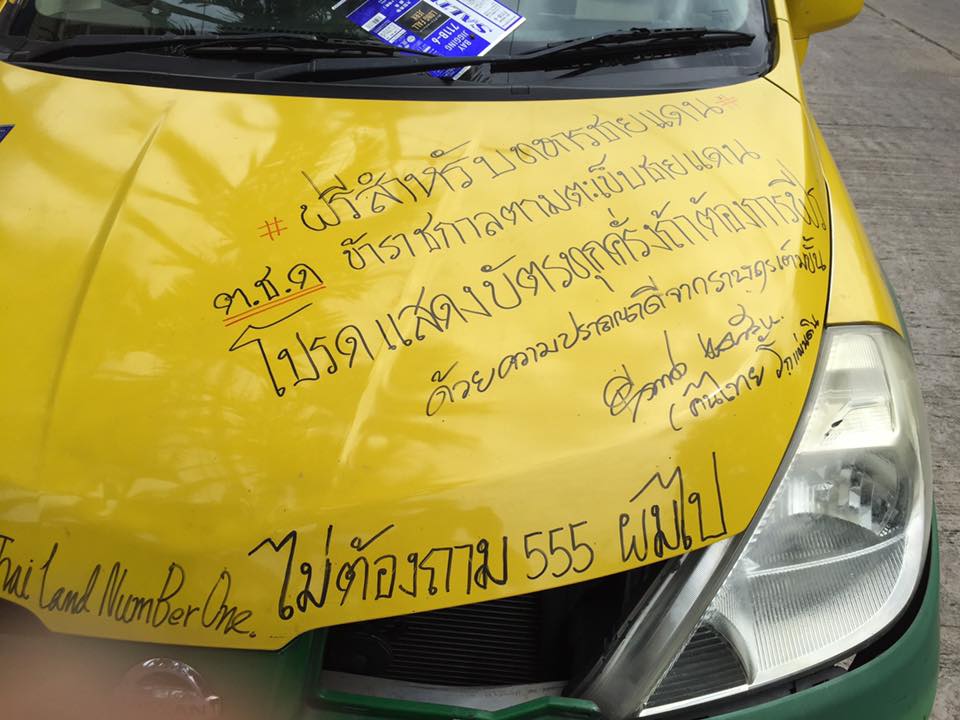 Facebook user Nattapol Mookkhun shared a photo of his neighbor with his green-yellow taxi, which circulated on Facebook last week. The taxi is full of messages written in permanent markers such as “No need to ask, I’m going,” and “Free rides for border soldier and police. Show your card if you want free service.”