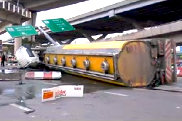 This morning, an 18-wheeler hauling a tank of 20,000 liters of diesel flipped on the outbound lanes of Phaholyothin Road, connected to the elevated Rangsit-Nakhon Nayok Road, in Pathum Thani’s Thanyaburi district. The accident and resultant spill blocked traffic and left motorists fearing an explosion.