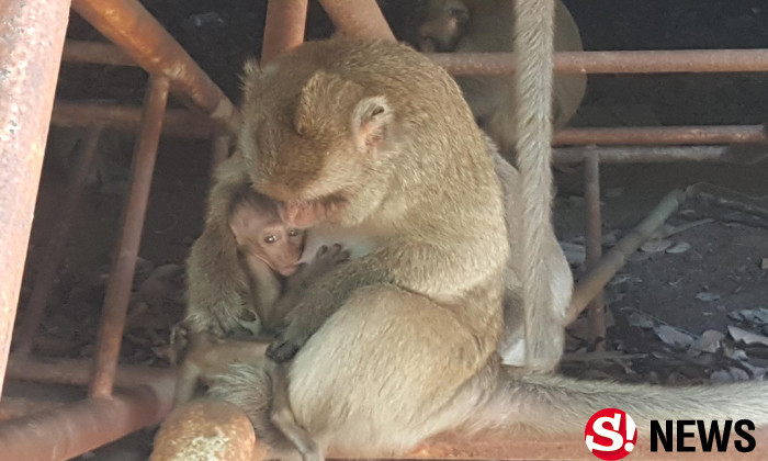 According to Luangta Yerm, the abbot of Hat Moon Krabue Temple, who feeds the monkeys, Khao Mao’s mother fell 30 meters to her death from a tree when she tried to run away from other apes.