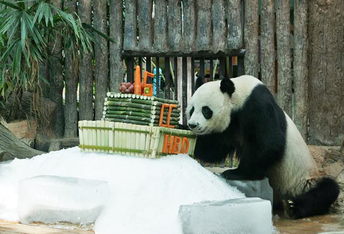 The celebrity panda unwrapped presents and dined on his favorite fruits as locals gathered at his party at Chiang Mai Zoo this morning.