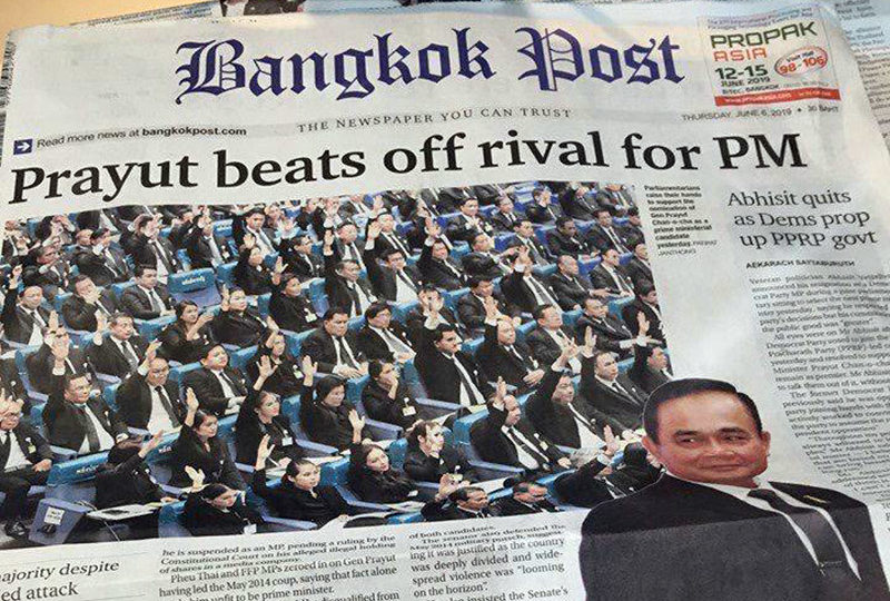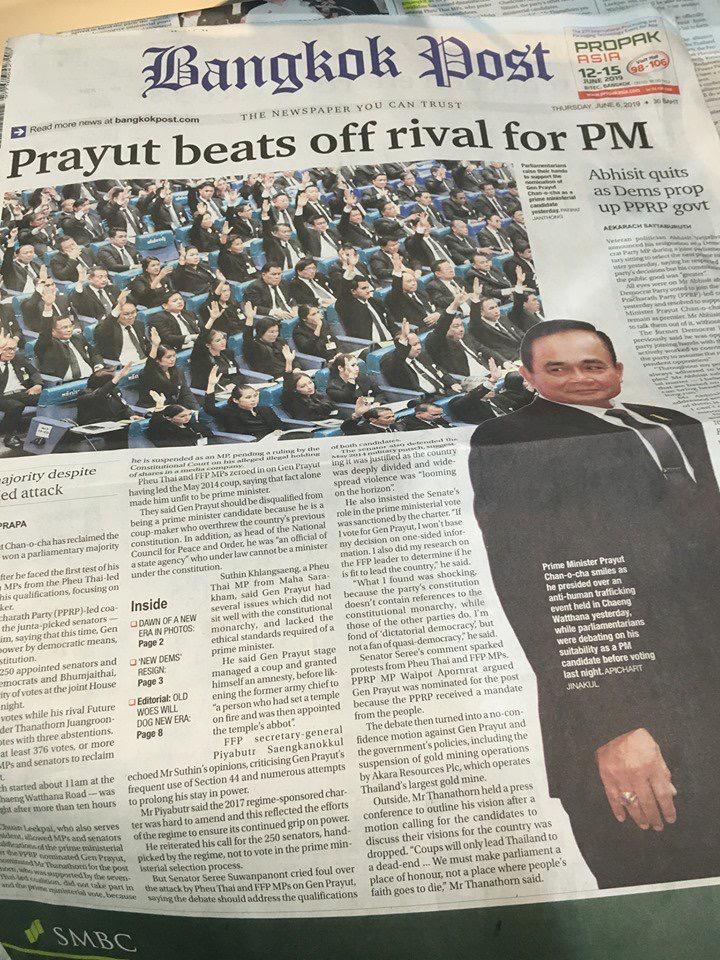 After yesterday’s memorable A1 headline read more like a Pornhub title, we waited to find out just how “Prayut beats off rival for PM” came to be. Sure enough, a source at the paper says it was entirely unwitting. Good job guys, and thanks for treating us all to that indelible mental image of Big Tu and Little Ake.