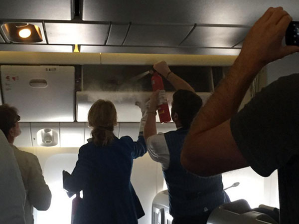 Smoke began pouring into the cabin from a fire inside an overhead baggage compartment on the KLM plane before a flight attendant expertly extinguished it.
