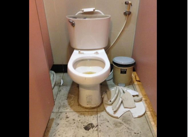 The story was featured in local media yesterday after a photo of the wrecked toilet was shared online by some hapless man who wandered into the toilet since the fight between the pee-er and the peeper