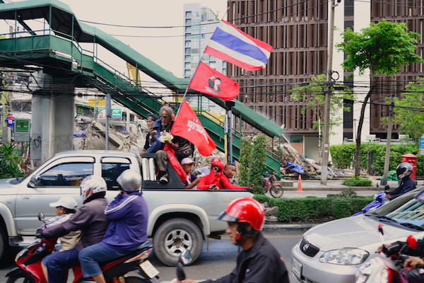 Coconuts today photographed some 600 protestors, who were travelling on pickup trucks and motorbikes, equipped with loudspeakers and banners. Today’s march is part of the three-week-long red-shirt protest, which started on April 22.