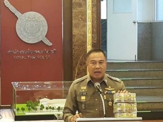Pol. Gen. Somyot lauded the investigation team for their hard work by offering them three fat stacks of cash worth THB1 million each, which sat in front of him at the podium.