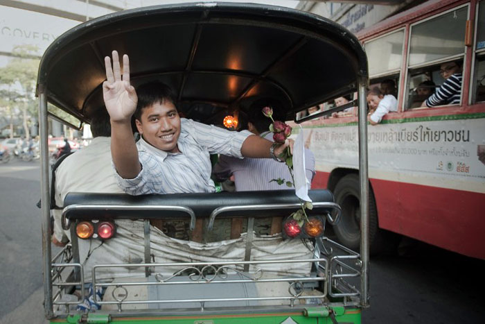 ABOVE: A demonstrator gives the three-fingered “Hunger Games” salute as he is taken away by police officers in a tuk-tuk after he was arrested while making a speech during a rally outside the Bangkok Art and Cultural Centre on Saturday. Photo: Nicolas Asfouri / AFP