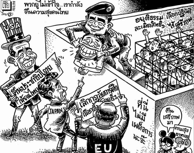 ABOVE: A cartoon from Sakda Sae-lew published in Thairath on Feb. 18. Prayuth Chan-ocha says, “You don’t understand. We’re returning happiness to the Thai people,” while other countries hold signs demanding the military returns democracy. Photo: Sia Thairath