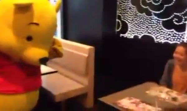 Dressed up in a cute Pooh Bear suit, the man embarrassedly walked into the restaurant where the camera was set up.