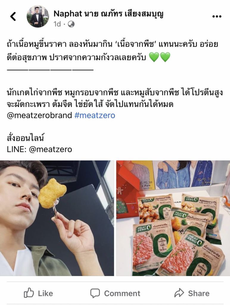 The 25-year-old actor has appeared in numerous television series and films, but is most recognized for his commercials. He is a paid presenter for Meat Zero, which sells 200 grams of meat alternative protein for THB79 at retail, almost twice pork’s current inflated price due to a shortage.