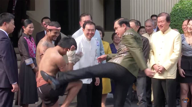In what seemed like an attempt to test the athlete’s alertness, Prayuth threw a surprise kick that landed on the side of the man’s body, while the press watched and his sycophants applauded and cheered him on.