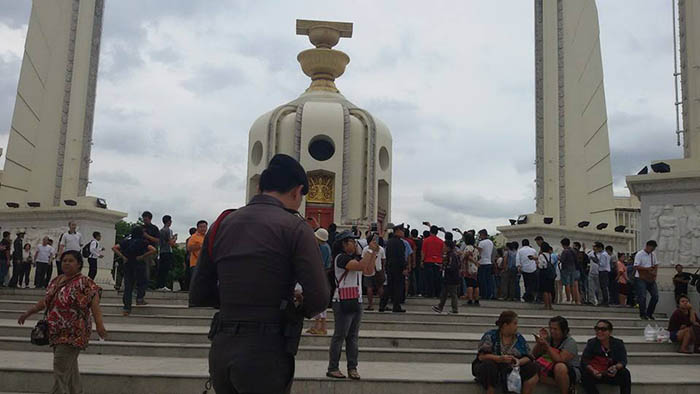 Holding banners reading “Long Live Democracy,” the student dissidents led a rally from Thammasat’s Thaprajan campus to pay respect at various monuments to past popular uprisings before arriving at the Democracy Monument.