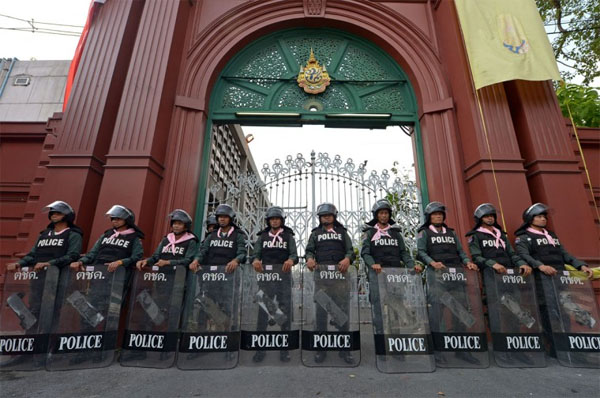 Riot police stand guard outside parliament yesterday as a no-confidence debate takes place inside the chamber. (Photo: AFP)