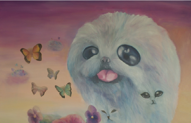 A white Persian cat arises from a cloud of pansies like a genie. Feline faces with imposing manga-like eyes appear in its body. Cupcakes and macaroons dot a backdrop of pastel hues.