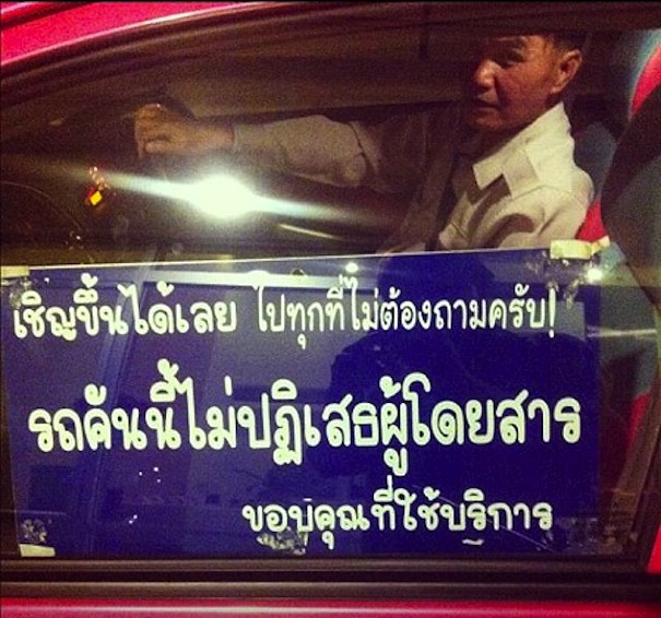 A Bangkok taxi driver has become an internet sensation after posting a sign in his window saying that he’ll take any passenger to any destination.