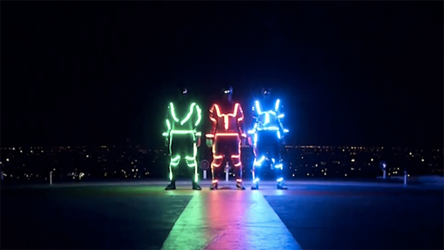 “The mix of dangerous stunts and exhaustion due to all-night shoots really tested our resolve to finish the video. Maintaining the suits in good condition was also a continual hassle,” says Sauer. “They needed to be disassembled from time to time so the batteries could be recharged, and damaged LED strips needed to be unthreaded and replaced. The schedule being what it was meant that the suits never really had time to air out. We had to work with the mild stench of men’s locker room on us the whole time. The low light conditions presented their own challenges for shooting, but did provide an opportunity to experiment with long exposure to create beautiful light stroke shots.”