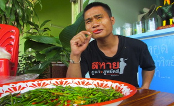 A discharged soldier from Nan Province in northern Thailand recently displayed his capsicum consuming prowess by eating 50 chilies in one sitting and then smearing more all over his face.