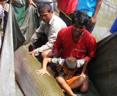 Locals in Ayutthaya caught three monster snakehead fish yesterday March 19, the largest measuring over 150kg and 2.3 meters long.