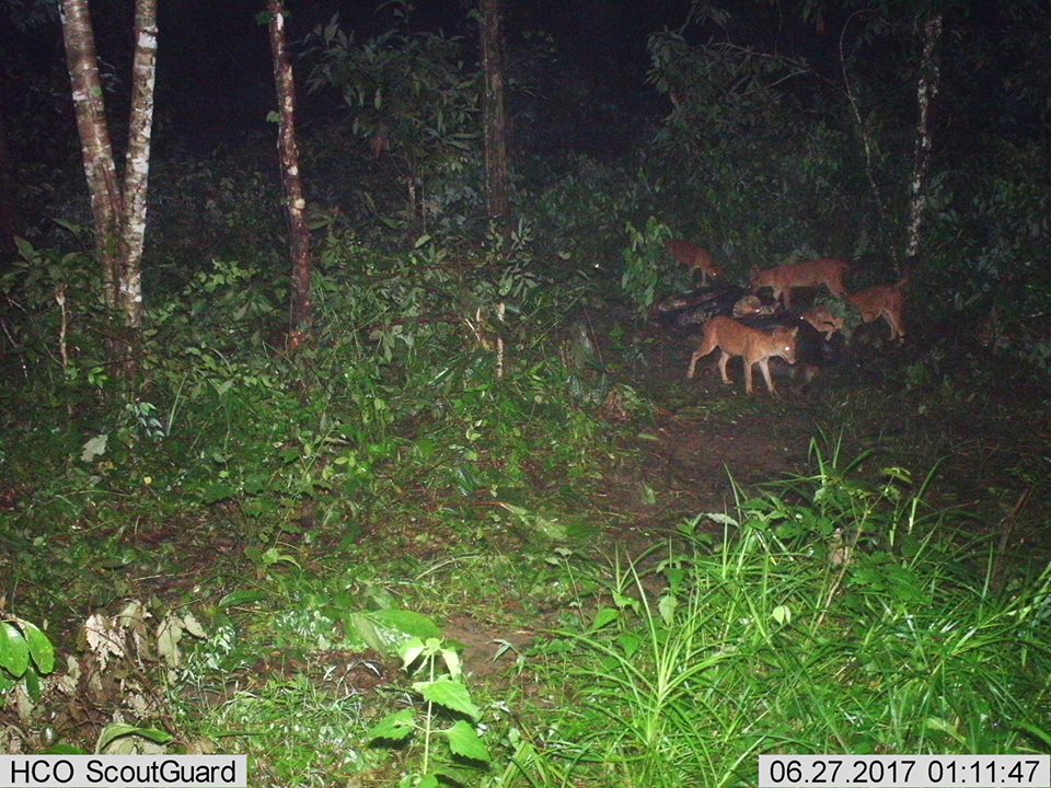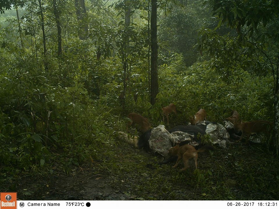 They were right. The camera traps were removed three days later and showed the images seen here. They include: an elephant feeding her calf as well as a pack of Asiatic wild dogs, a bear, and a porcupine eating the gaur’s remains.