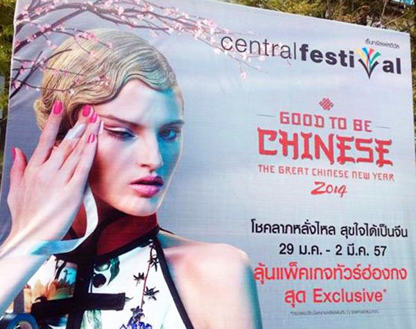 Herro, you likee buy big discount handsome man? You likee racially insensitive marketing campaigns? Retailer Central Pattana pulled a Chinese New Year promotion and apologized after some were offended by an image of a Caucasian model making a distinctive, anachronistic gesture once commonly used to denigrate Asians.