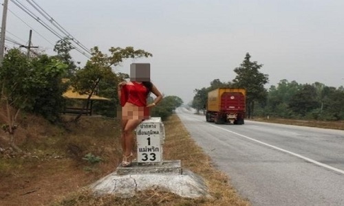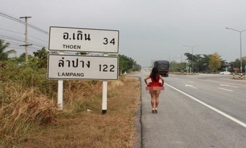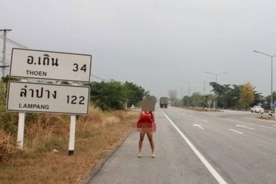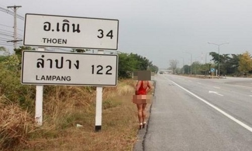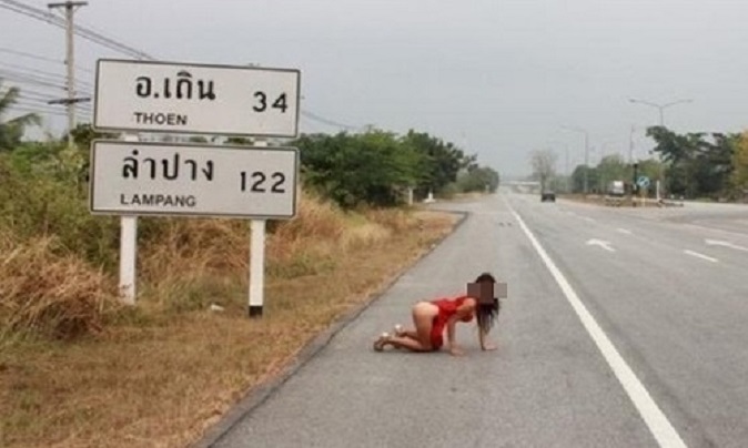 Police are tracking down a daring, half-naked babe who crawled and posed and flashed motorists in Lampang province after her photos spread online recently, despite the fact they could be decades old.