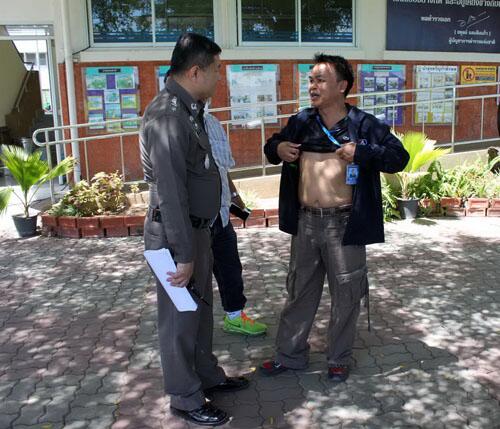 Tomchan Boonsai showing his bruises to Thammasala police: Photo: @Nakhon224