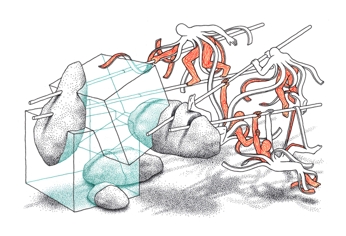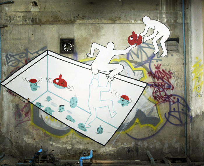 “From miniature drawings to huge wall paintings Botlek’s mysterious and fascinating imagination is immediately recognizable. In the lineage of Dutch graphic artist M.C. Escher, Botlek plays with architecture, perspective and impossible spaces with a humorous acid twist,” wrote curator Myrtille Tibayrenc of the former Toot Yung Art Center.