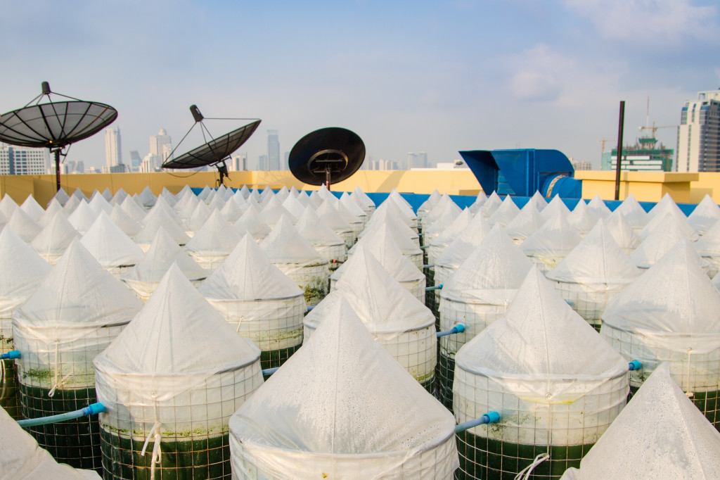 On a hotel rooftop in Bangkok, dozens of barrels of green liquid bubble under the sun — the latest innovation in urban farming.