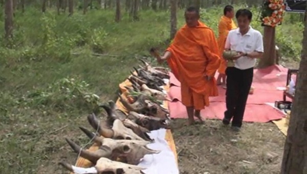 Monks prayed at a merit-making ceremony earlier this month held in response to the deaths of rare 18 gaurs who have died under mysterious circumstances during the past month. Bhramin priests also intoned a curse that anyone responsible for killing the animals should also die.Photo: Thai PBS