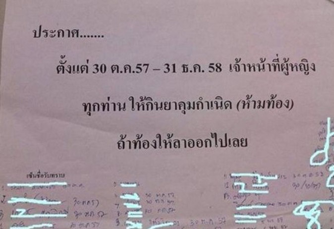 “Announcement: From Oct. 30 – Dec. 31, 2014, female staff must take birth control (Do not get pregnant). If you do, please resign.”