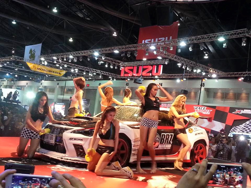 A Bangkok car show got underway yesterday with a featured auto lathered in white bubbles, but as usual no one was looking at the auto.