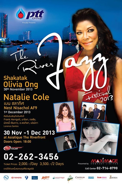 The River Jazz Festival will be headlined by Singaporean artist Olivia Ong and the ‘80s jazz-funk band ‘Shakatak’ from the United Kingdom, who will perform their singles on Saturday. Or wait until Sunday to hear powerful voice of Ben Chalatit, Frank Herrgott and Natalie Cole, the American singer known for “Pink Cadillac” and her famous, posthumous duet with her father, Nat King Cole.