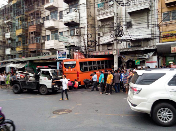 After reportedly working 51 hours in three days, the driver of minibus No.12 drove into the taxi stand and a store at Promphan intersection on Soi Prachasongkroh 14 yesterday evening, severing the leg of one of the motorcyclists.