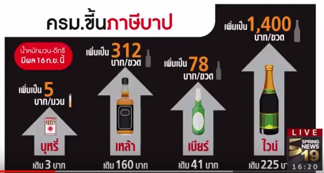 The Thai video report says that bottles of booze will have a tax increase of THB152 (US$4.6) per bottle, jumping from THB160 to THB312 (US$9.4).