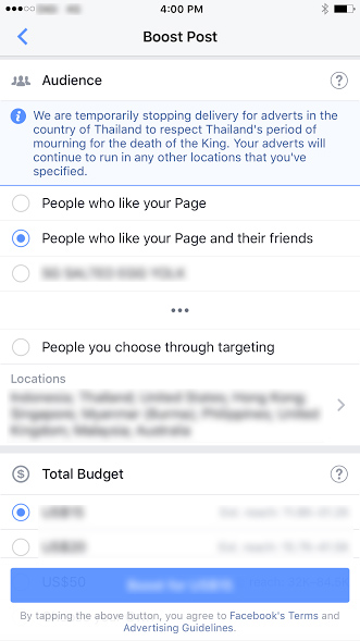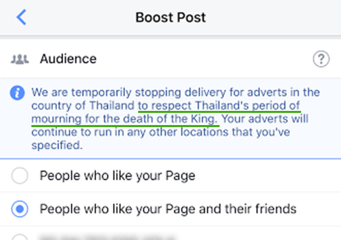 Radha, a Facebook advertising representative, told Coconuts that, “Out of respect for the passing of Thailand’s King Bhumibol Adulyadej, we’re temporarily not showing ads in Thailand.”