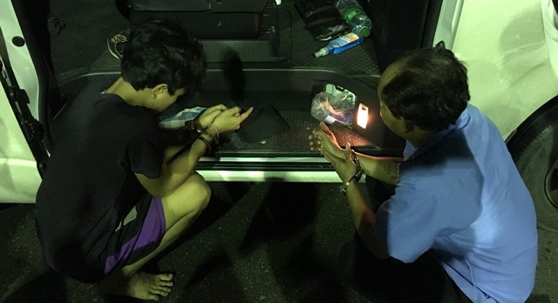 A team of officers from Tha Chatchai Police, led by Lt. Col. Nokorn Chutong, arrested van driver Uthai Jankarn, 41, and his accomplice, Phuwadon Pornsawangniwet, 20, both from Trang, when they carried out a routine search of their minivan and found the pills inside a compartment of the white Phuket-registered Toyota commercial passenger van.
