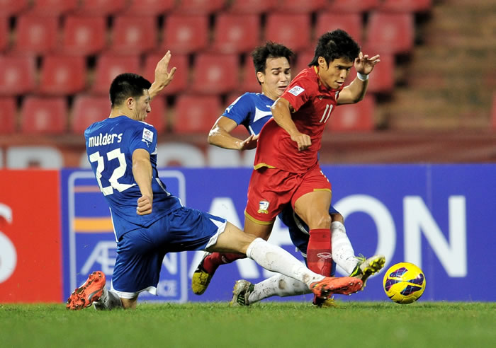 But Thailand took a deserved lead in the 39th minute when midfielder Jakkapan struck home a lay back from speedy wing back Theerathon Bunmathan, the only player from 2011 Thai Premier League champions Buriram in the squad.