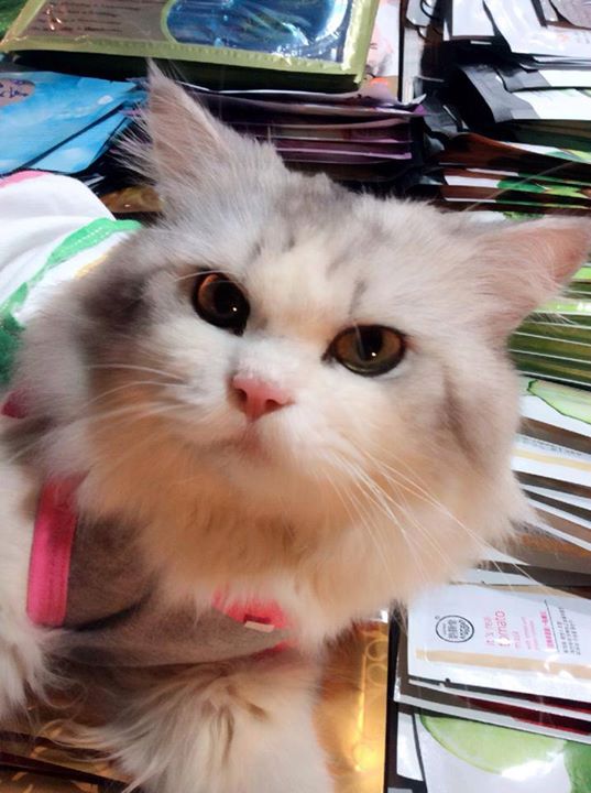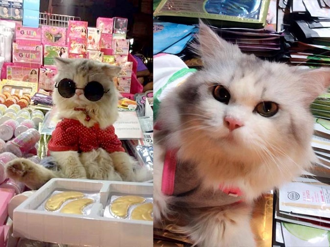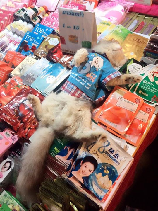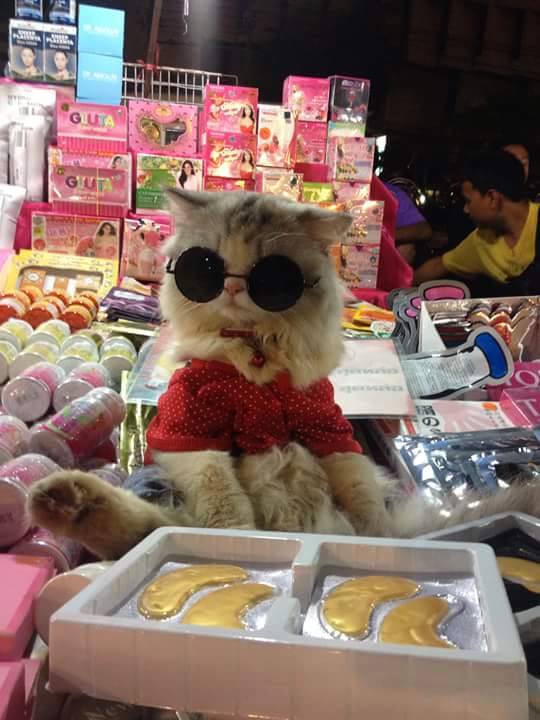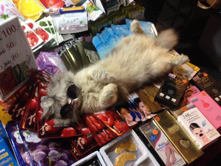 This chill-ass kitty travels with his human to sell cosmetics at different street markets, where he’s routinely spotted sleeping atop piles of face masks and high-fiving customers.