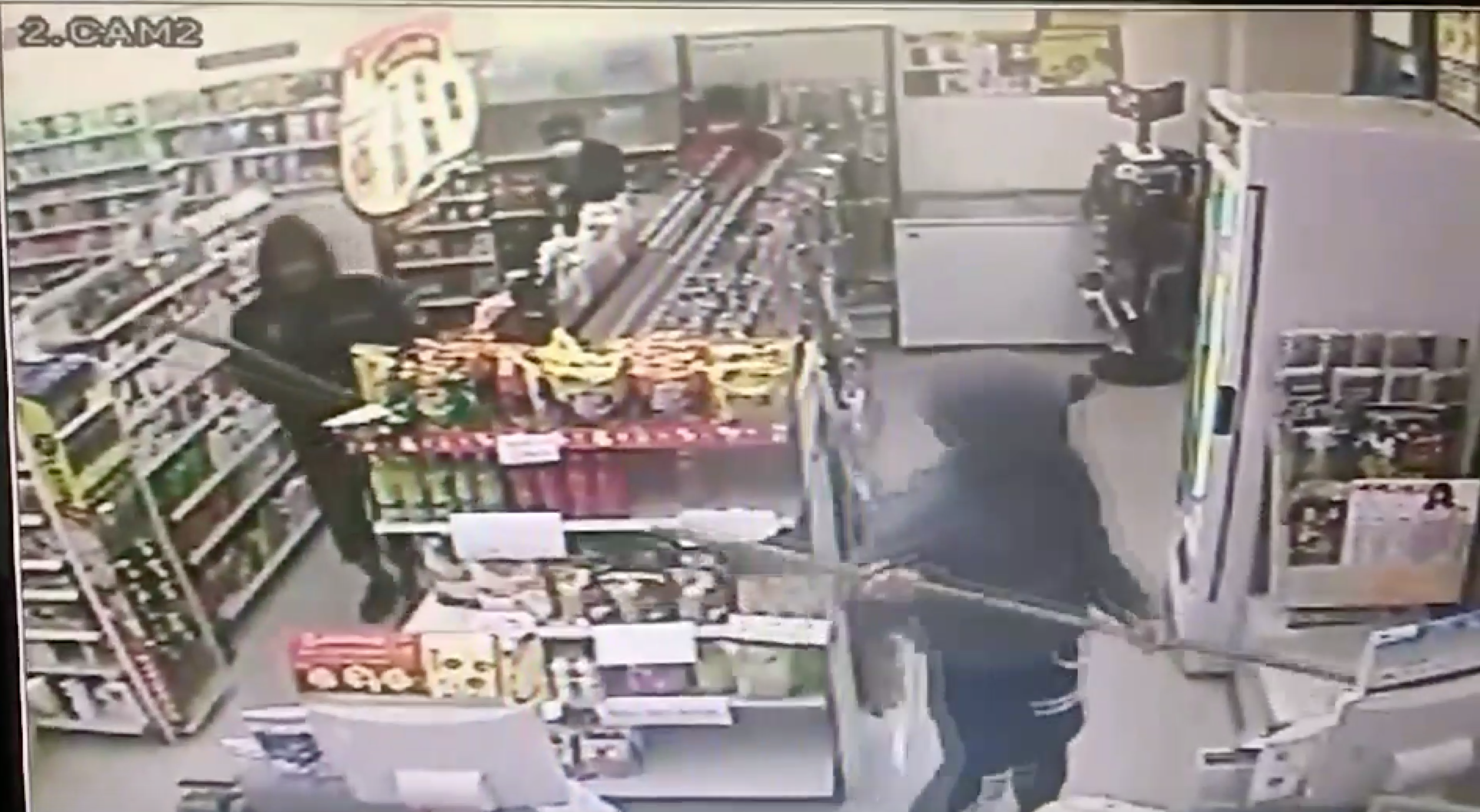 The footage shows multiple men dressed in black, their faces covered and hoodies pulled over their heads, walking through the store with their sticks as though looking for someone.
