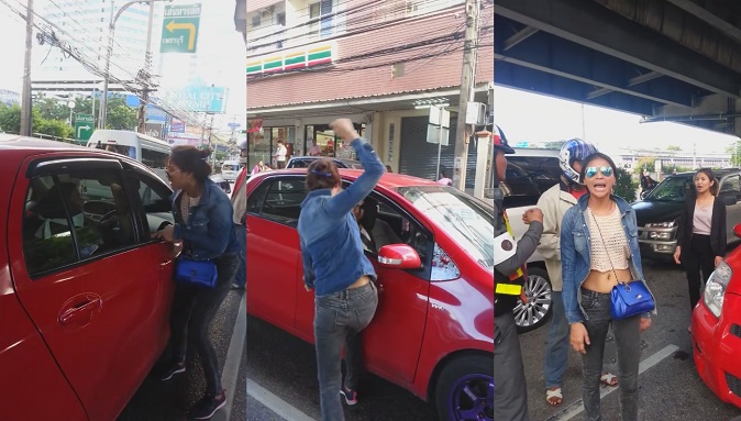 “Come on! Get out of the car!” Todsaporn is heard shouting while slamming her fist repeatedly at the driver’s face, who has lowered her window.