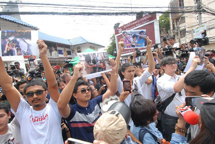 ABOVE: Student activists and their supporters cheer outside the Pathumwan Police Station and display photos they say show abusive treatment of protesters on May 22. Photo : Khaosod English