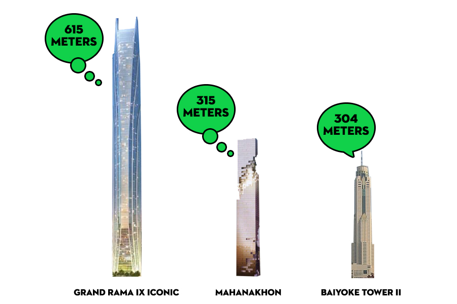 How the Grand Rama Super Tower stacks up to Bangkok’s current- and next-tallest skyscrapers. Illustration: Coconuts Bangkok