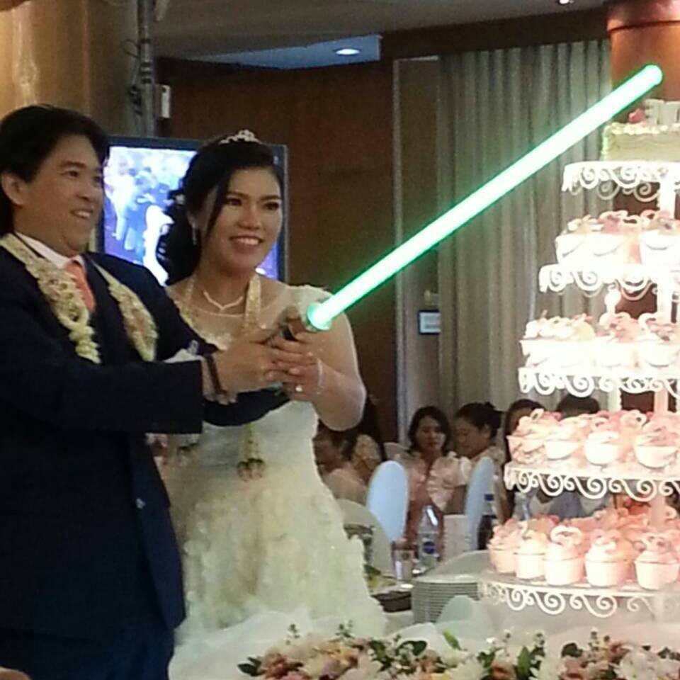 First of all, they ditched “Here Comes the Bride” in favor of walking down the aisle to the Superman theme, while what could better cut a cake than a swift slice from a Jedi’s lightsaber?