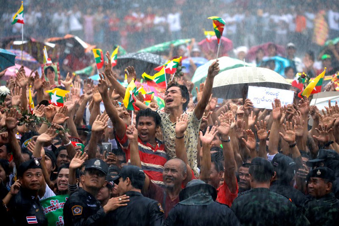 Suu Kyi arrived on Thursday to a frenzied welcome from some of the hundreds of thousands of her compatriots who have sought work and sanctuary from war across the border.