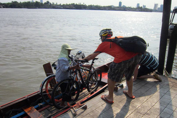 Cycling to a pier near Wat Khlong Toei, bikers pay 20 baht each to pile their bikes into a tiny boat. Although it’s a short crossing to the other side, this ferry service is not a particularly comfortable ride for those averse to small, unstable boats carrying far too much cargo.
